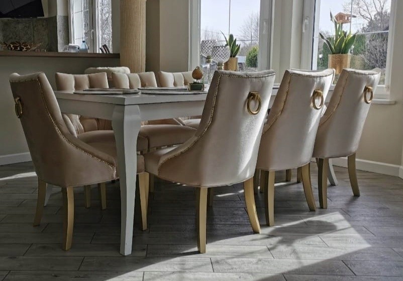 ZESTAW GLAMOUR Stół Rozkładany BIAŁY LUDWIK MST-8 100x200/300 +2x50cm długość po rozłożeniu 250/300cm i 8 krzeseł tapicerowanych KARINE ze złotą kołatką i pinezkami w stylu GLAMOUR