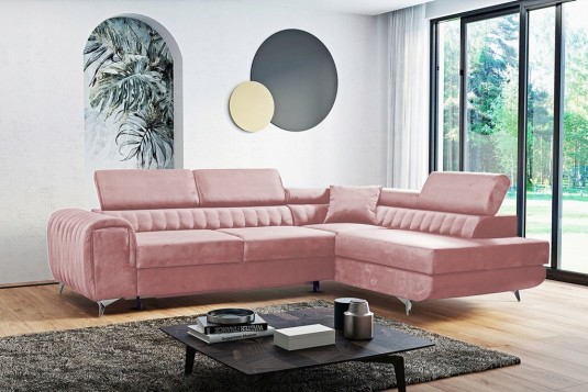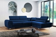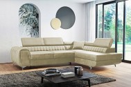 Narożnik EGO TKANINA PLAOMOODPORNA. Posiada funkcję spania oraz pojemnik na pościel. Nogi w narożniku zastosowano chromowe. Narożnik posiada 3 regulowane zagłówki oraz ozdobne przeszycia .