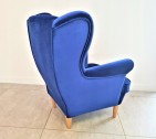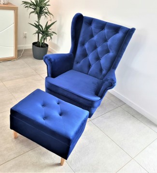 PIĘKNY DUŻY SOLIDNY FOTEL NOBI USZAK + PODNÓŻEK OTWIERANY W WYBRANYM KOLORZE Z DREWNIANYM NÓŻKAMI TYPU LUDWIK WZÓR PIKOWANIA KARO GUZIKI