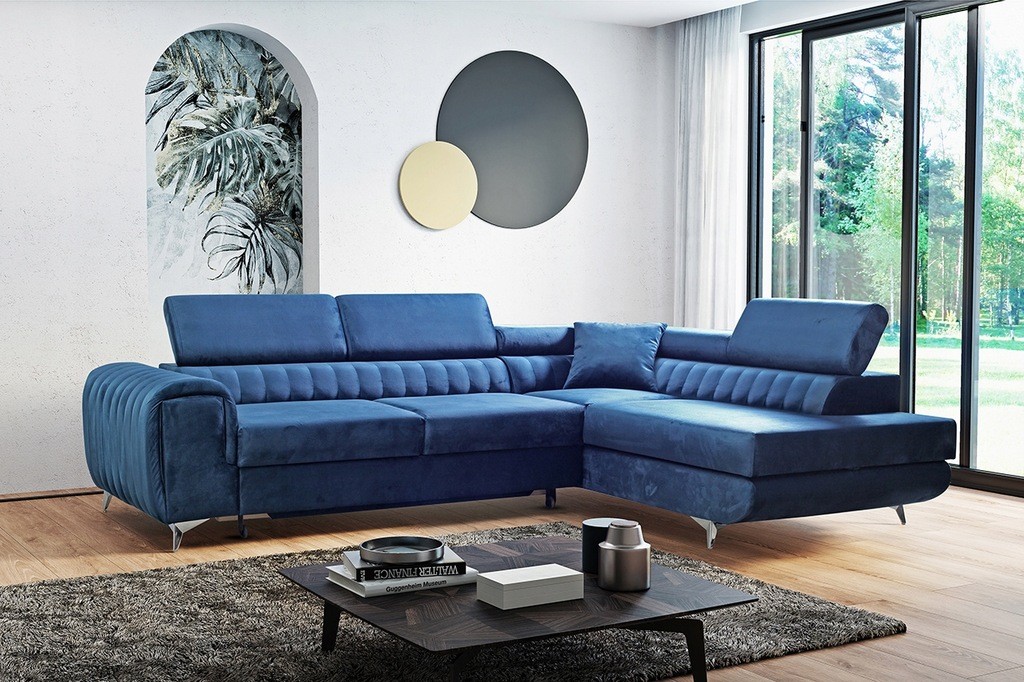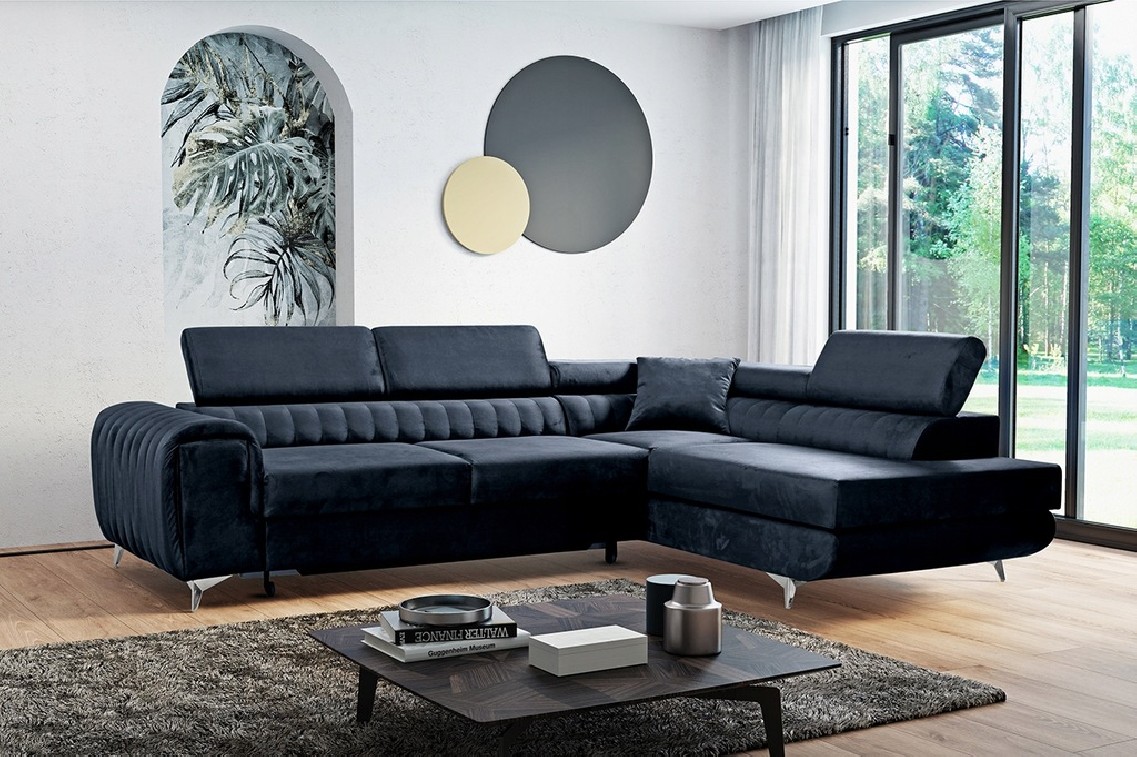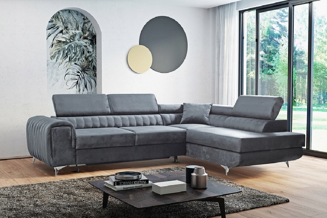 Narożnik EGO TKANINA PLAOMOODPORNA. Posiada funkcję spania oraz pojemnik na pościel. Nogi w narożniku zastosowano chromowe. Narożnik posiada 3 regulowane zagłówki oraz ozdobne przeszycia .