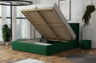 Łóżko tapicerowane sypialnianie wykonujemy w czterech tkaninach , Dodatkowo jest to łóżko z pojemnikiem na pościel oraz stelażem podnoszonym do góry. Stelaż jest drewniany z podnośnikami sprężynowymi jednak można go zamienić na stelaż na metalowej ramie z podnośnikami gazowymi(zdjęcie niżej)