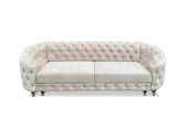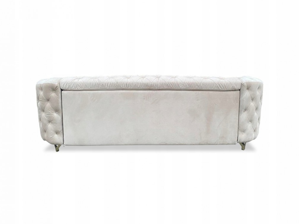 PIĘKNA DUŻA SOLIDNA KANAPA MOLLI ROZKŁADANA Z POJEMNIKIEM NA POŚCIEL W KOLORZE BEŻOWYM Z DREWNIANYMI PROSTYMI NÓŻKAMI WZÓR PIKOWANIA GUZIKI STYL Chesterfield