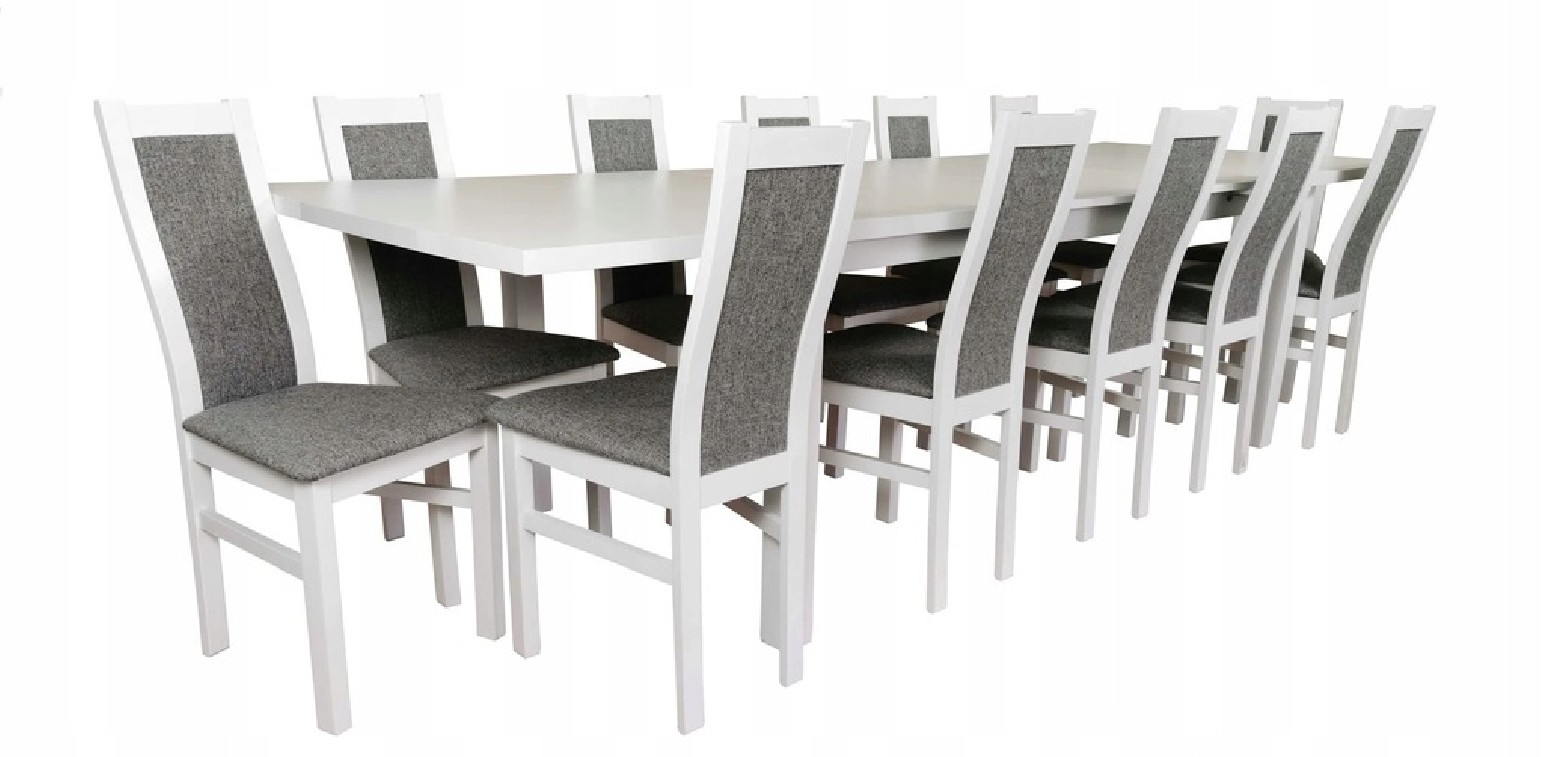 Piękny BIAŁY DUŻY ZESTAW stół LAMINOWANY rozkładany ML-8 100x200+2x50 wkładka długość po rozłożeniu 250/300cm i 12 krzeseł MA-27 z litego drewna bukowego.