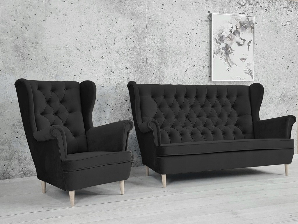 ZESTAW SOFA USZAK DWUOSOBOWA NA DREWNIANYCH NOGACH + FOTEL USZAK W DOWOLNYM WYBRANYM KOLORZE Z DREWNIANYMI NÓŻKAMI WZÓR PIKOWANIA OPARCIA GŁĘBOKI PIK KARO GUZIKI