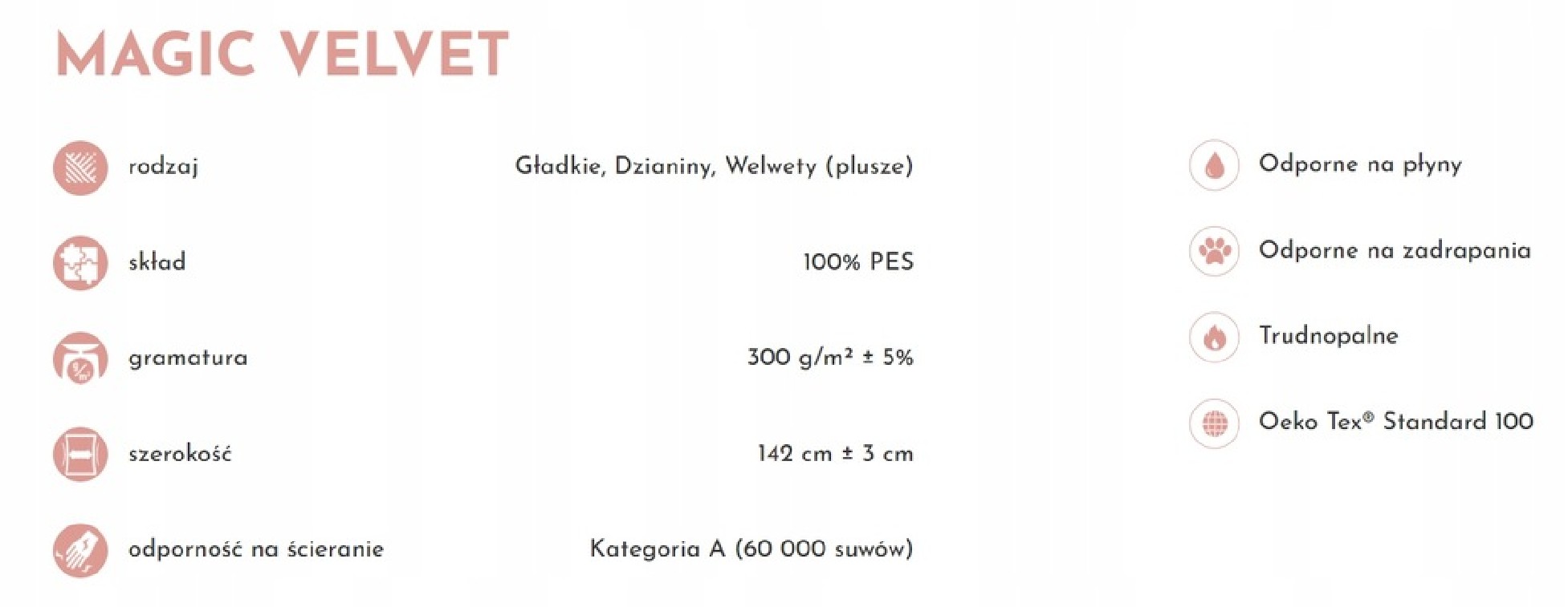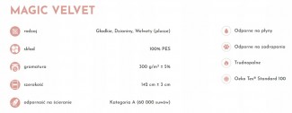 Dodatkowym atutem materiału Magic Velvet są właściwości Cleanaboo, które ograniczają wchłanianie cieczy. Rozlana ciecz przyjmie formę kropel, które z łatwością usuniesz z tkaniny. Kolekcja przeszła również pozytywnie test papierosa oraz posiada certyfikat PETPROOF, który informuje o zwiększonej odporności na zadrapania i zaciągnięcia wywołane kocimi oraz psimi pazurkami.