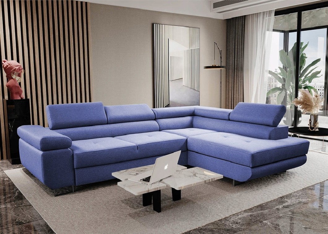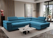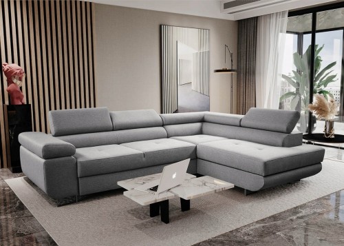 Narożnik ANTOS L posiada funkcję spania oraz pojemnik na pościel. Nogi w narożniku zastosowano chromowe. Narożnik posiada 3 regulowane zagłówki, ozdobne przeszycia oraz piki na siedzisku.