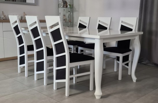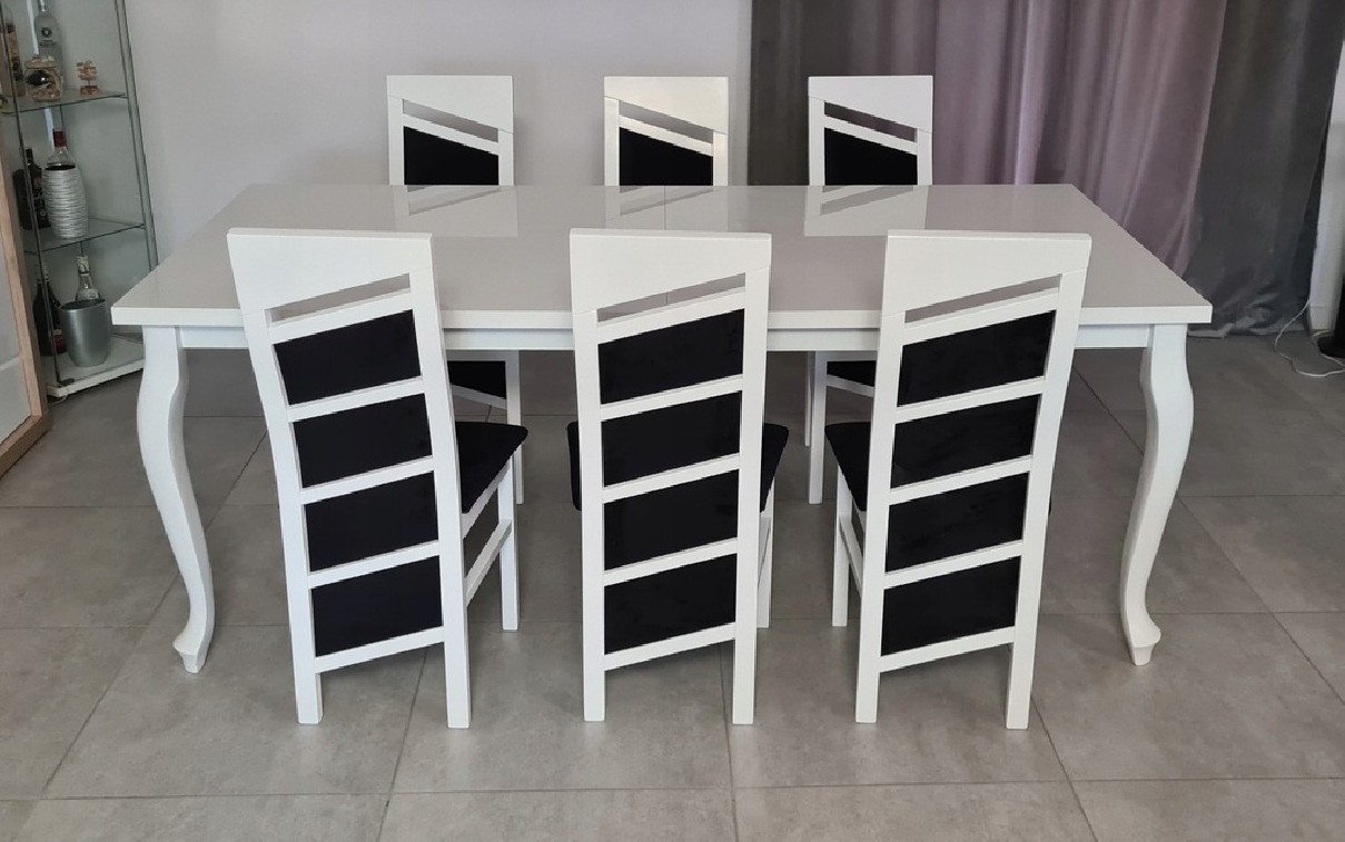 Piękny BIAŁY ZESTAW Stół rozkładany MST-8 90x170+2x40 wkładka długość po rozłożeniu 210/250cm i 6 krzeseł SKOS z litego drewna bukowego.