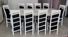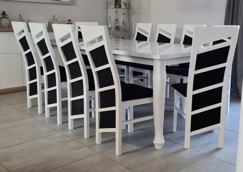 Piękny BIAŁY ZESTAW Stół rozkładany MST-8 100x200+2x50 wkładka długość po rozłożeniu 250/300cm i 10 krzeseł SKOS z litego drewna bukowego.