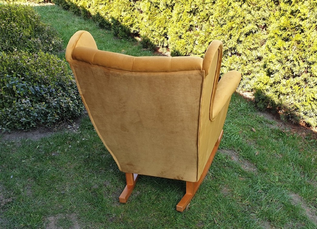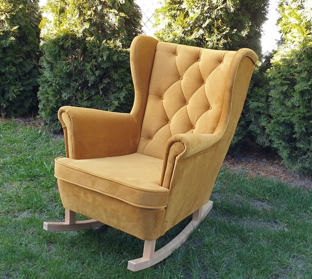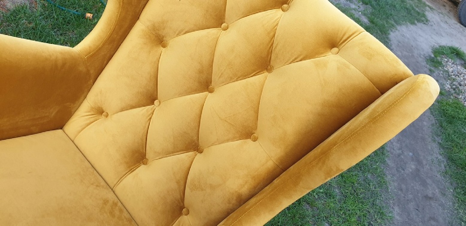 PIĘKNY DUŻY SOLIDNY FOTEL BUJANY MALAGA USZAK W KOLORZE ŻÓŁTYM Z DREWNIANYM PŁOZAMI WZÓR PIKOWANIA OPARCIA KARO GUZIKI