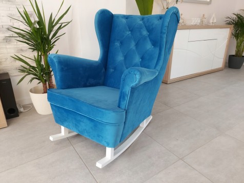 PIĘKNY DUŻY SOLIDNY FOTEL BUJANY MALAGA USZAK W KOLORZE NIEBIESKIM Z DREWNIANYM PŁOZAMI WZÓR PIKOWANIA OPARCIA KARO GUZIKI