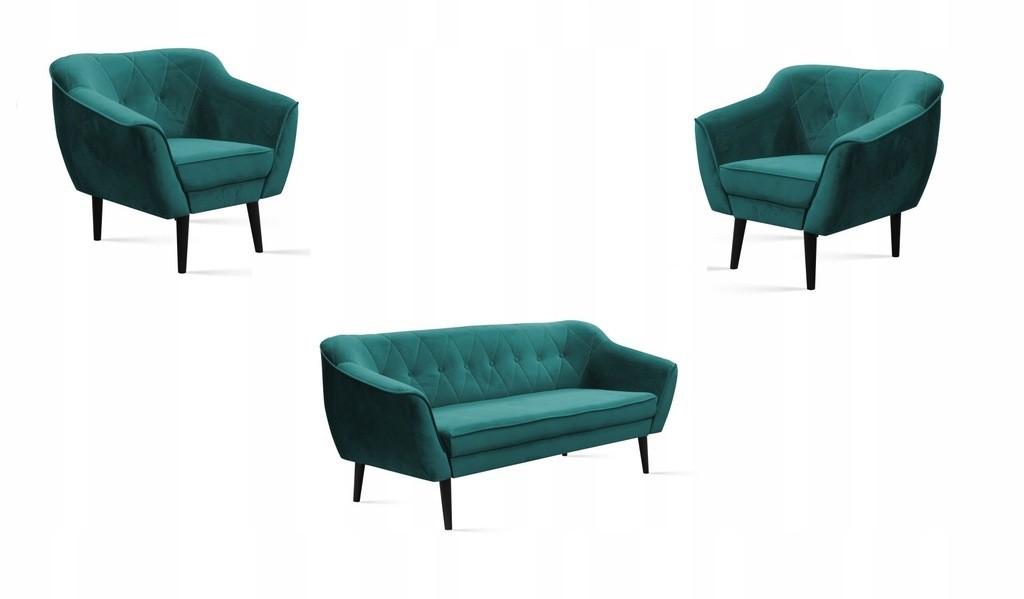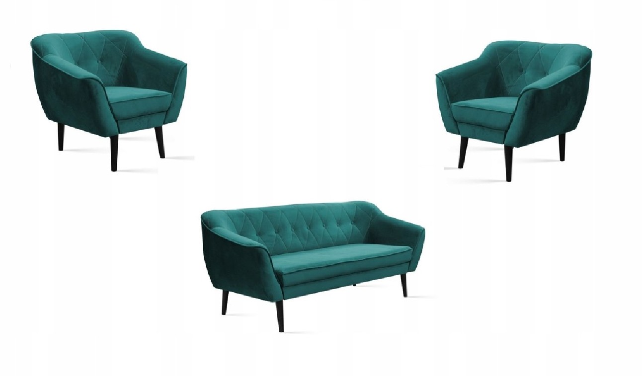 SOLIDNA SOFA MAYA 3 + 2 FOTELE W KOLORZE ZIELONYM Z DREWNIANYMI NÓŻKAMI WZÓR PIKOWANIA OPARCIA ROMBY