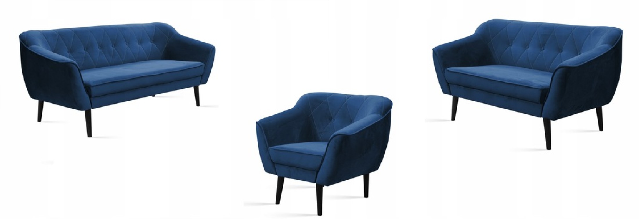 SOLIDNA SOFA 3 + 2 +1 W KOLORZE NIEBIESKIM Z DREWNIANYM CZARNYMI NÓŻKAMI WZÓR PIKOWANIA OPARCIA KARO GUZIKI