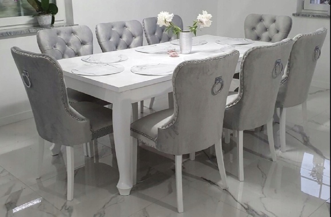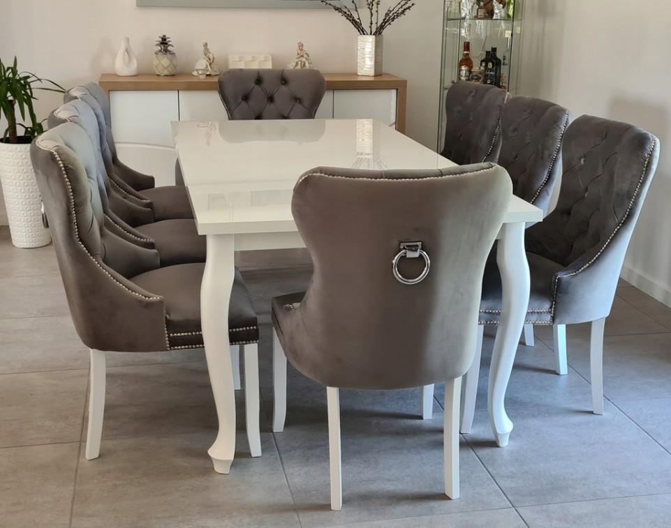 PIĘKNY ZESTAW GLAMOUR Stół rozkładany BIAŁY LUDWIK MST-8 100x200/300 +2x50cm długość po rozłożeniu 250/300cm i 8 krzeseł tapicerowanych ze srebrną kołatką i pinezkami w stylu GLAMOUR MADAME .