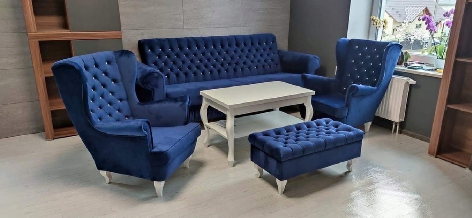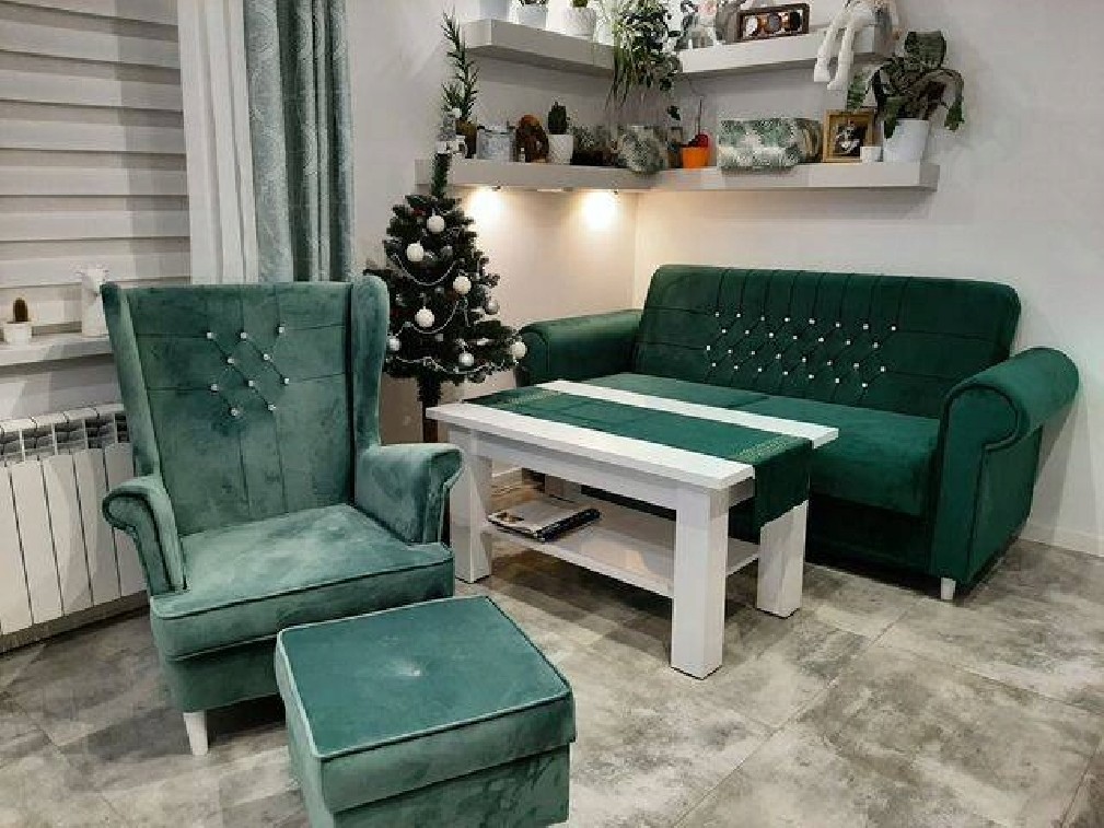 PIĘKNY DUŻY ZESTAW SKANDYNAWSKI GLAMOUR SOLIDNA SOFA ROZKŁĄDANA 3 osobowa + 2 FOTELE USZAK + Podnóżek W WYBRANYM KOLORZE Z DREWNIANYM BIAŁYMI NÓŻKAMI WZÓR PIKOWANIA OPARCIA GŁEBOKIE PIKI KARO GUZIKI