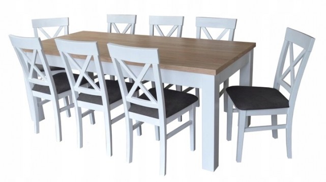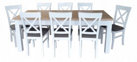 DUŻY BIAŁY ZESTAW Stół naturalny fornir dębowy MST-8 100x200+2x50 wkładka długość po rozłożeniu 250 lub 300 cm i 8 krzeseł KRZYŻ z litego drewna bukowego.