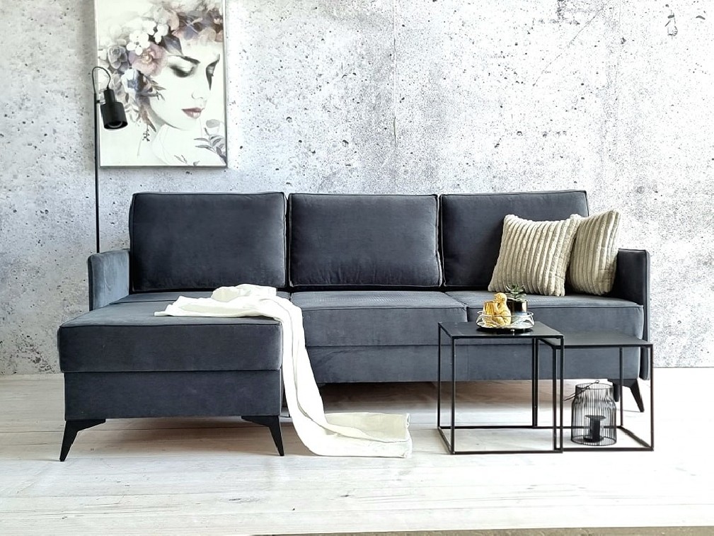 KOMPAKTOWY NAROŻNIK STELLA W SZARYM ODCIENIU Z METALOWYMI CZARNYMI NÓŻKAMI.