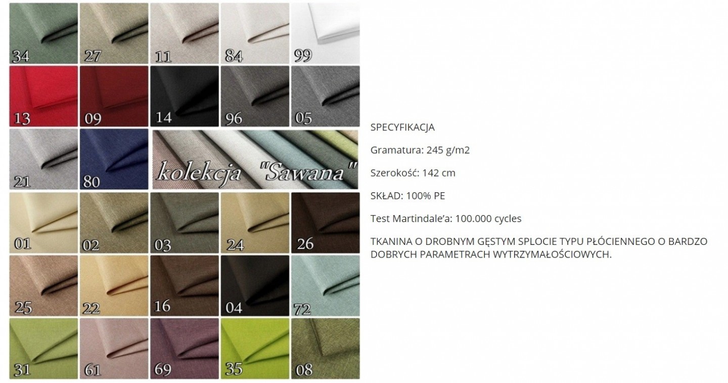 W ofercie posiadamy 9 kolekcji tkanin w tym (neon, sawana oraz suedin cenie). Kolekcje, zostały wybrane po szczegółowej kontroli. Tkaniny są bardzo wytrzymałe, odporne na ścieranie a przede wszystkim PLAMOODPORNE.
