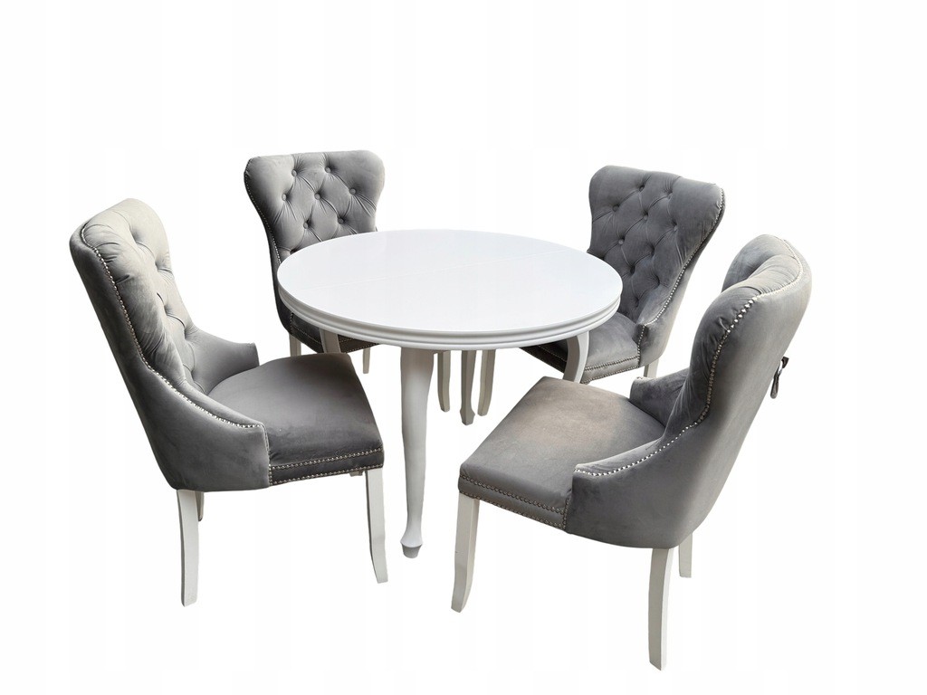 Elegancki Biały Zestaw do Salonu w Stylu Glamour – Stół o średnicy 110 cm MS-3 LUDWIK i 4 Krzesła MADAME
