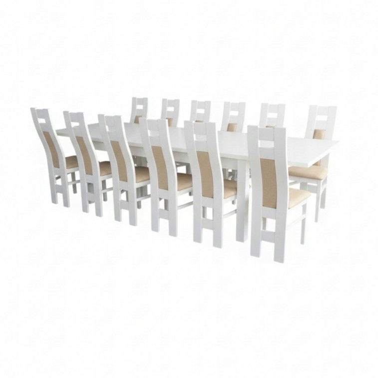 Biały Zestaw Klasyczny: Rozkładany Stół MST-8 (100x350 cm) + 12 Krzeseł MK 57 N z Litego Drewna