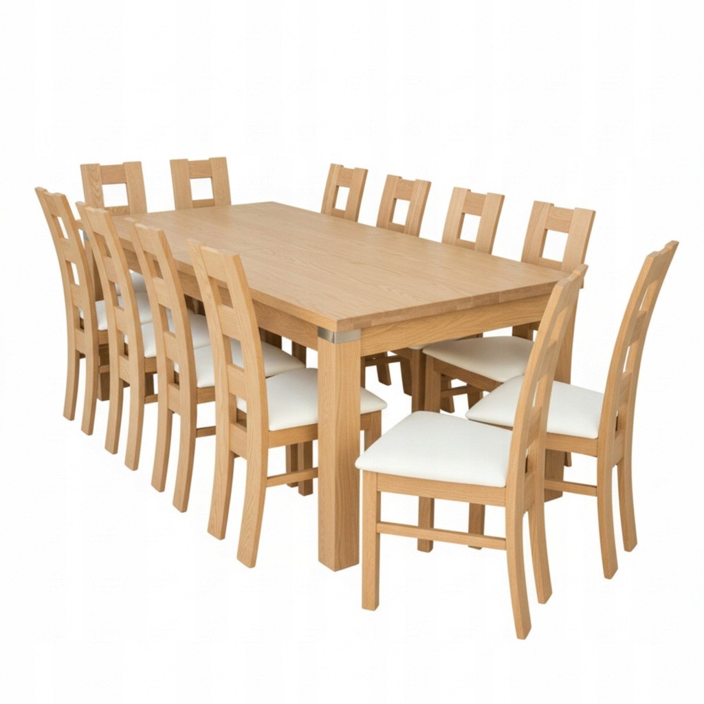 DUŻY ZESTAW DĘBOWY FORNIR NATURALNY STÓŁ ROZKŁADANY NA PROWADNICACH STALOWYCH MST-8 100x250+2 wkładki 50 cm po rozłożeniu 300 lub 350cm i 12 krzeseł K-41(kostka) z litego drewna bukowego.