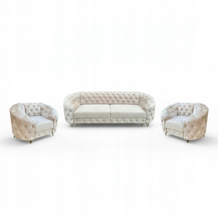 PIĘKNY DUŻY ZESTAW CHESTERFELD DO SALONU. SOLIDNA ROZKŁADANA SOFA MOLLY 3 OSOBOWA + 2 FOTELE MOLLY W WYBRANYM KOLORZE Z DREWNIANYMI NÓŻKAMI WZÓR PIKOWANIA OPARCIA GŁEBOKIE PIKI