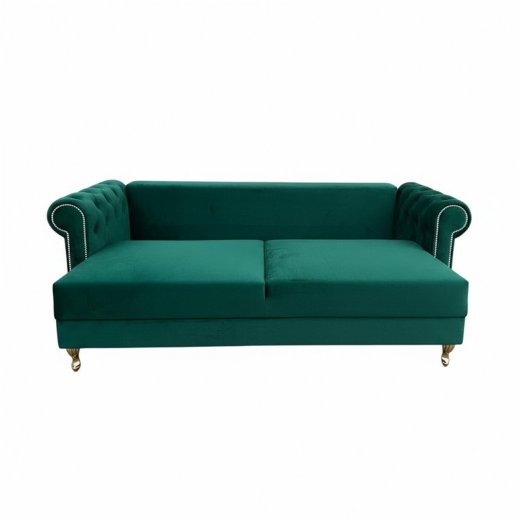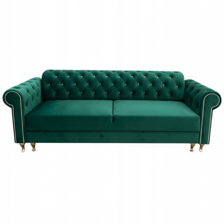 KANAPA PIKOWANA W STYLU CHESTERFIELD BELLA Z FUNKCJĄ SPANIA I PRAKTYCZNYM POJEMNIKIEM NA POŚCIEL W KOLORZE ZIELONYM Z PROSTYMI DREWNIANYMI NÓŻKAMI WZÓR PIKOWANIA OPARCIA KARO GUZIKI.