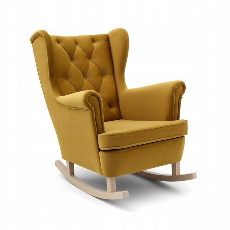 SOLIDNY FOTEL BUJANY MALAGA USZAK W KOLORZE ŻÓŁTYM Z DREWNIANYMI PŁOZAMI WZÓR PIKOWANIA OPARCIA KARO GUZIKI