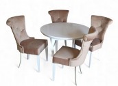 Piękny BIAŁY ZESTAW W STYLU GLAMOUR. STÓŁ OKRĄGŁY ROZKŁADANY MST-3 fi 110+2x 50cm wkładka długość po rozłożeniu 210 cm + 4 krzesła CAMILA