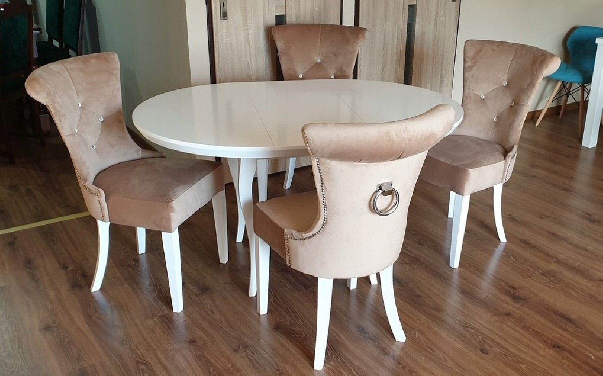 Na siedzisku i oparciu krzeseł znajduje się tapicerka oraz pianka poliuretanowa, na której jest wysokiej klasy materiał. .Klient może wybrać dowolną tapicerkę oraz wybarwienie drewna. Blat stołu wykonany jest z płyty MDF pomalowany białym lakierem który nadaje powtarzalnego uroku.
