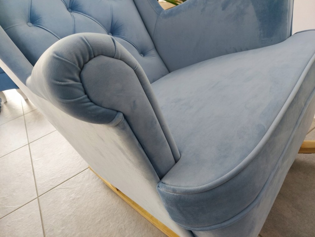 PIĘKNY DUŻY SOLIDNY FOTEL BUJANY MALAGA USZAK W KOLORZE BŁĘKITNYM Z DREWNIANYM PŁOZAMI WZÓR PIKOWANIA OPARCIA KARO GUZIKI
