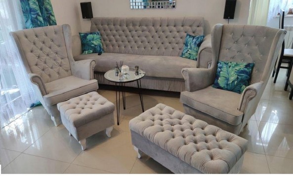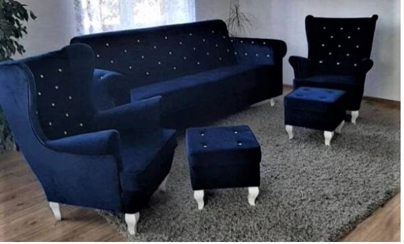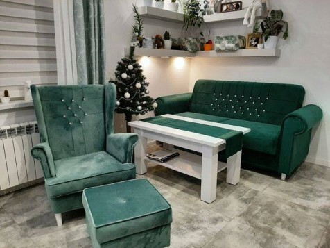 ZESTAW WYPOCZYNKOWY SOFA ROZKŁADANA + FOTEL PIKOWANY Z PODNÓŻKIEM