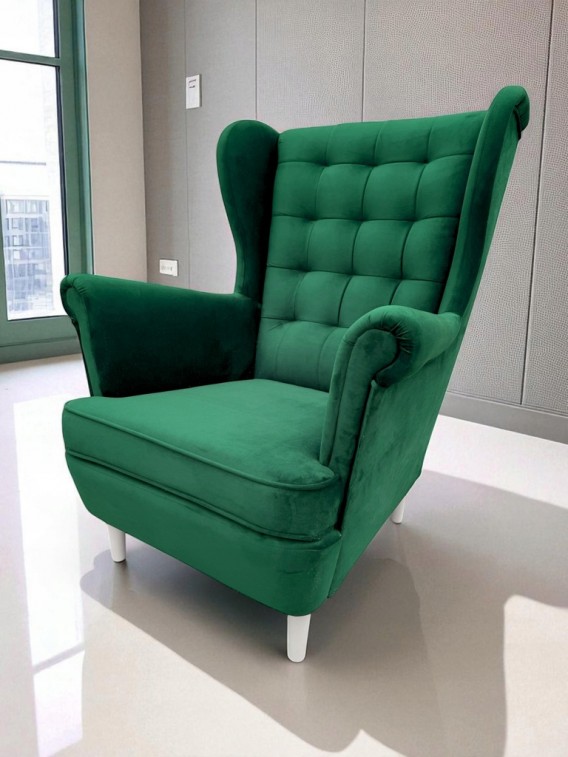 PIĘKNY DUŻY SOLIDNY FOTEL USZAK NOBI WE WCIĄGI USZAK W WYBRANYM KOLORZE Z PROSTYMI NÓŻKAMI WZÓR PIKOWANIA WCIĄGI