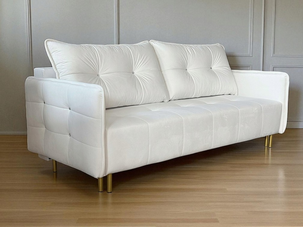 KOMPAKTOWA KANAPA AURORA SLIM W KREMOWYM ODCIENIU Z DREWNIANYMI NÓŻKAMI. WZÓR PIKOWANIA. PIKI + OZDOBNE PRZESZYCIA