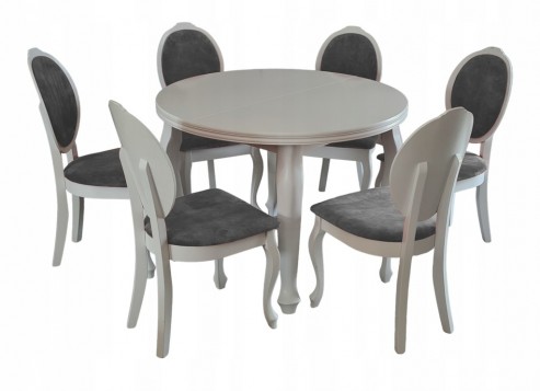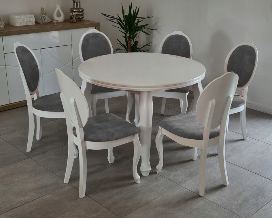 BIAŁY ZESTAW stół okrągły rozkładany MS-3 LUDWIK 110cm+2x50cm wkładka długość po rozłożeniu 160/210cm i 6 krzeseł z litego drewna bukowego JULIA.
