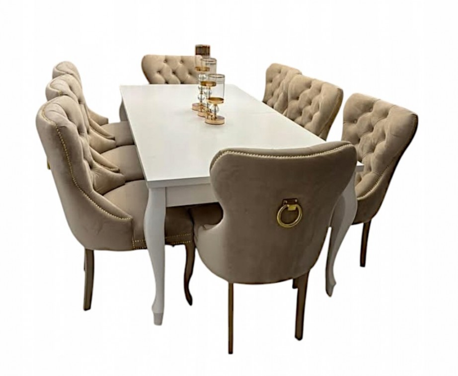 Na siedzisku znajduje się sprężyna falista i pianka poliuretanowa , która obita jest wysokiej klasy materiałem . Klient może wybrać dowolną tapicerkę oraz wybarwienie drewna. Blat stołu wykonany jest z płyty MDF pokrytej lakierem który zabezpiecza przed uszkodzeniem.