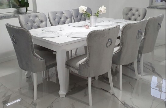 PIĘKNY ZESTAW GLAMOUR Stół rozkładany BIAŁY LUDWIK MST-8 100x250/350 +2x50cm długość po rozłożeniu 300 LUB 350cm i 8 krzeseł tapicerowanych ze złotą kołatką i pinezkami w stylu GLAMOUR MADAME .