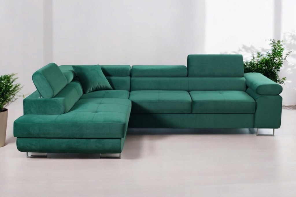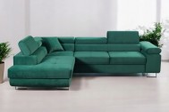 Narożnik ANTOS L posiada funkcję spania oraz pojemnik na pościel. Nogi w narożniku zastosowano chromowe. Narożnik posiada 4 regulowane zagłówki, ozdobne przeszycia oraz piki na siedzisku.