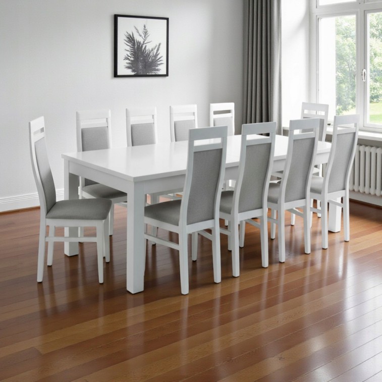 Stół rozkładany MST-8 100x250+2x50 wkładka długość po rozłożeniu 300/350cm i 10 krzeseł LUNA z litego drewna bukowego.