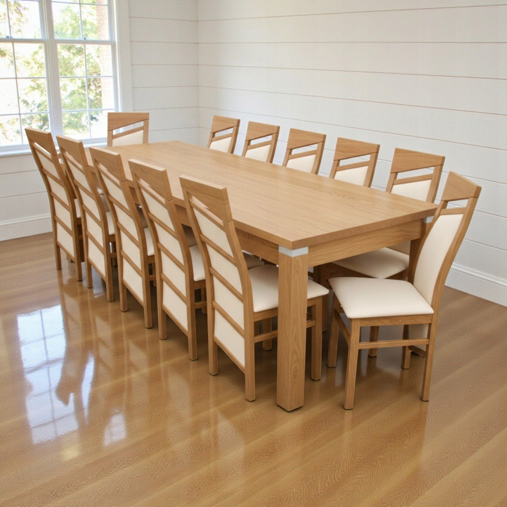 Szukasz solidnych, eleganckich mebli, które pomieszczą dużą rodzinę i gości? Mamy dla Ciebie idealne rozwiązanie! Prezentujemy nowy, luksusowy komplet składający się z rozkładanego stołu z blatem z naturalnego forniru dębowego oraz 12 wytrzymałych krzeseł z litego drewna bukowego.