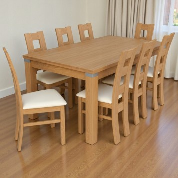 Na siedzisku znajduje się tapicerka oraz pianka poliuretanowa, na której jest wysokiej klasy materiał. Można zrobić również krzesła z siedziskiem bez tapicerki .Klient może wybrać dowolną tapicerkę oraz wybarwienie drewna. Blat stołu wykonany jest z płyty MDF