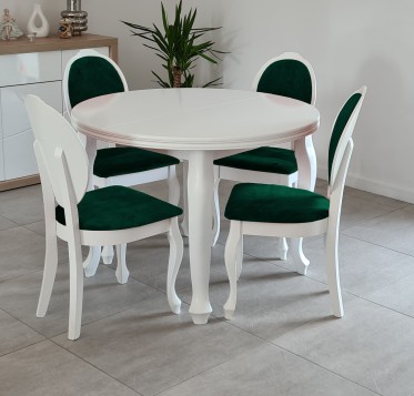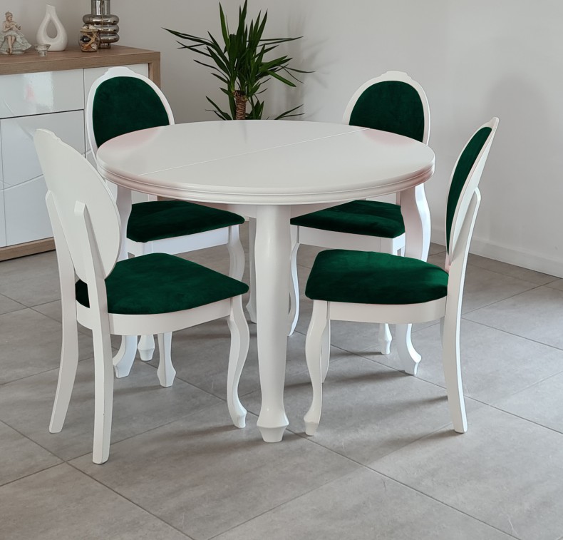 Piękny BIAŁY ZESTAW okrągły stół rozkładany MST-3 110/210+2x50 wkładka długość po rozłożeniu 160/210cm i 4 krzesła JULIA z litego drewna bukowego.
