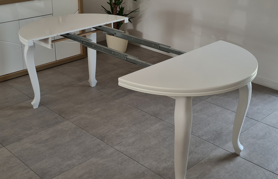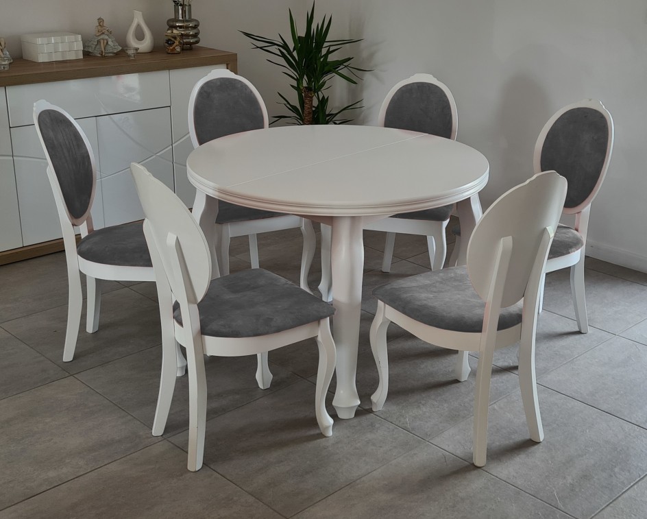 BIAŁY DUŻY ZESTAW LUDWIK STÓŁ OKRĄGŁY 110/210+2X50 WKŁAD + 6 KRZESEŁ Z LITEGO DREWNA