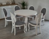 Piękny BIAŁY ZESTAW okrągły stół rozkładany MST-3 110/210+2x50 wkładka długość po rozłożeniu 160/210cm i 6 krzeseł JULIA z litego drewna bukowego.