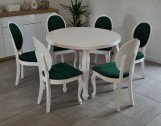 Piękny BIAŁY ZESTAW okrągły stół rozkładany MST-3 110/210+2x50 wkładka długość po rozłożeniu 160/210cm i 6 krzeseł JULIA z litego drewna bukowego.