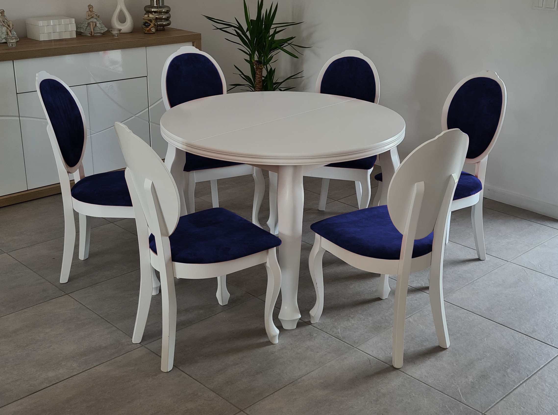 BIAŁY DUŻY ZESTAW LUDWIK STÓŁ OKRĄGŁY 110/210+2X50 WKŁAD + 6 KRZESEŁ Z LITEGO DREWNA
