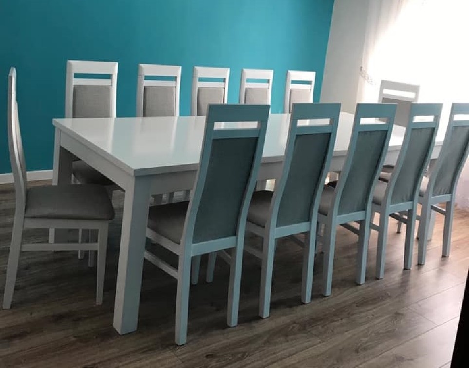 Piękny BIAŁY DUŻY ZESTAW stół rozkładany MST-8 100x250+2x50 wkładka długość po rozłożeniu 300/350cm i 12 krzeseł LUNA z litego drewna bukowego.