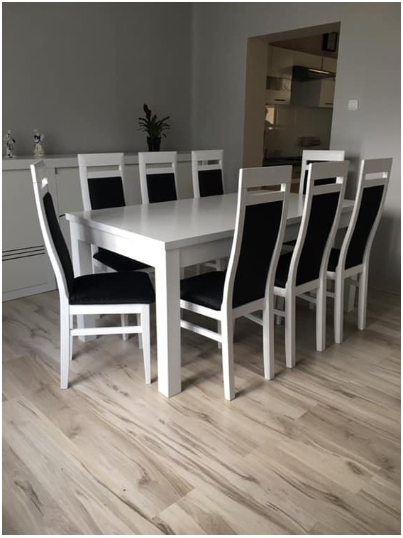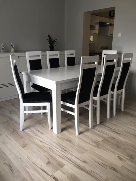 Piękny BIAŁY DUŻY ZESTAW stół rozkładany MST-8 100x250+2x50 wkładka długość po rozłożeniu 200/300cm i 8 krzeseł LUNA z litego drewna bukowego.