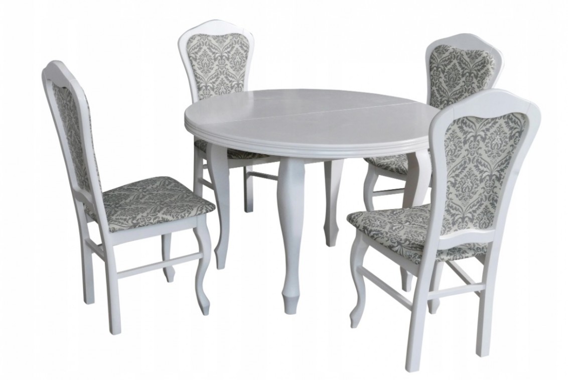 Piękny BIAŁY DUŻY ZESTAW okrągły stół rozkładany MST-3 90/130+1x40 wkładka długość po rozłożeniu 130cm i 4 krzeseła MK-27 z litego drewna bukowego.