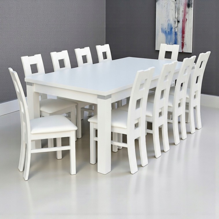 DUŻY BIAŁY ZESTAW STÓŁ 100x250/ 350cm + 10 KRZESEŁ Z LITEGO DREWNA