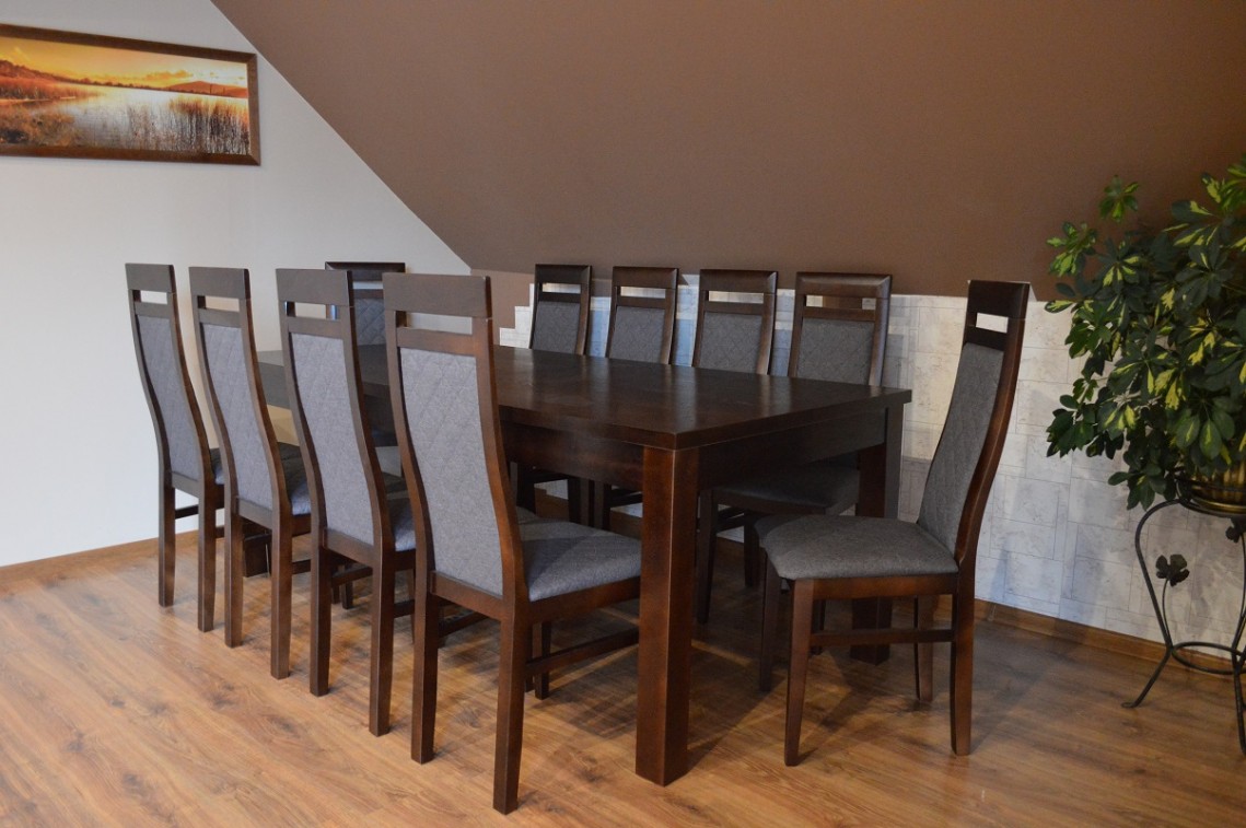 Na siedzisku znajduje się tapicerka oraz pianka poliuretanowa, na którą naciągnięty jest wysokiej klasy materiał. Można zrobić również krzesła z siedziskiem bez tapicerki .Klient może wybrać dowolną tapicerkę oraz wybarwienie drewna. Blat stołu wykonany jest z płyty MDF pokrytej laminatem lub fornirem naturalnym oraz lakierem który zabezpiecza przed uszkodzeniem.